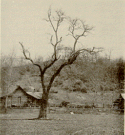 There were six or eight men with Riddle, and when they reached Benjamin Cutbirth's home the day before, four miles above Duncan's home, and failed to get any information from him, they abused him shamefully and left him under guard. Cleveland ran into the ambush and was taken into the Perkins house, which stool on the site of the house in which Nathan Waugh's son, Charles, now resides. (1915) The photo shows the present house and apple tree in its front under which it is said Cleveland was sitting when captured. Into this house, Zachariah Wells followed Cleveland and attempted to shoot him, but that brave (?) man seized Abigail Walters, who was present, and kept her between him and his would-be assassin.